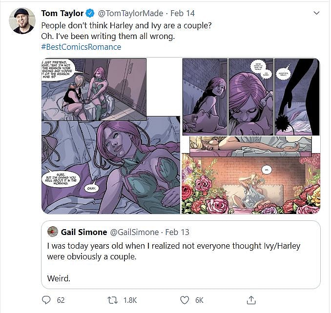 Taylor added, “People don’t think Harley and Ivy are a couple? Oh. I’ve been writing them all wrong. #BestComicsRomance”