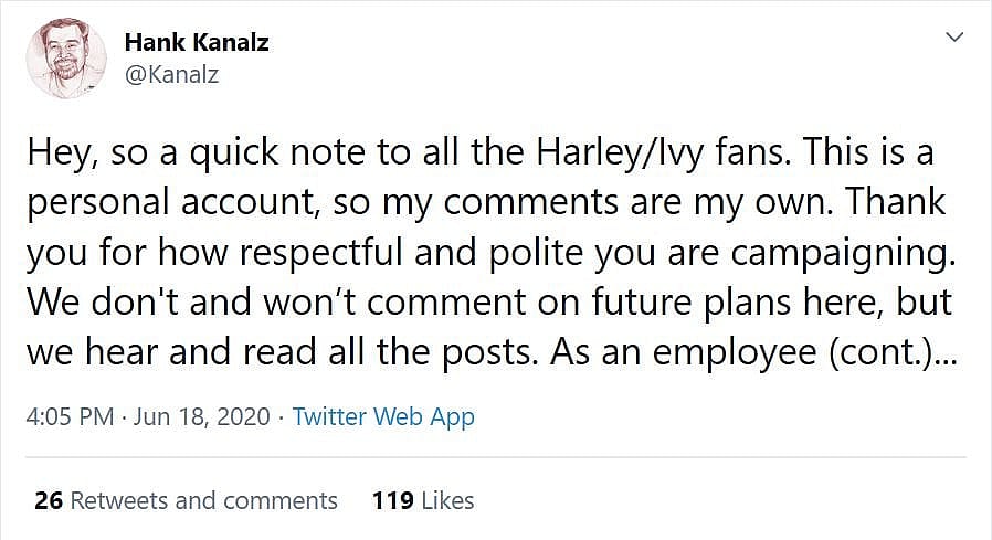 He wrote in June, “Hey, so a quick note to all the Harley/Ivy fans. This is a personal account, so my comments are my own. Thank you for how respectful and polite you are campaigning. We don’t and won’t comment on future plans here, but we hear and read all the posts.”