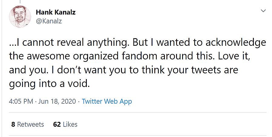 He then added, “As an employee I cannot reveal anything. But I wanted to acknowledge the awesome organized fandom around this. Love it, and you. I don’t want you to think your tweets are going into a void.”