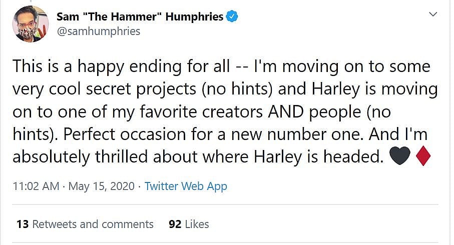 However, later in May he noted how excited he was for the future of Harley Quinn.