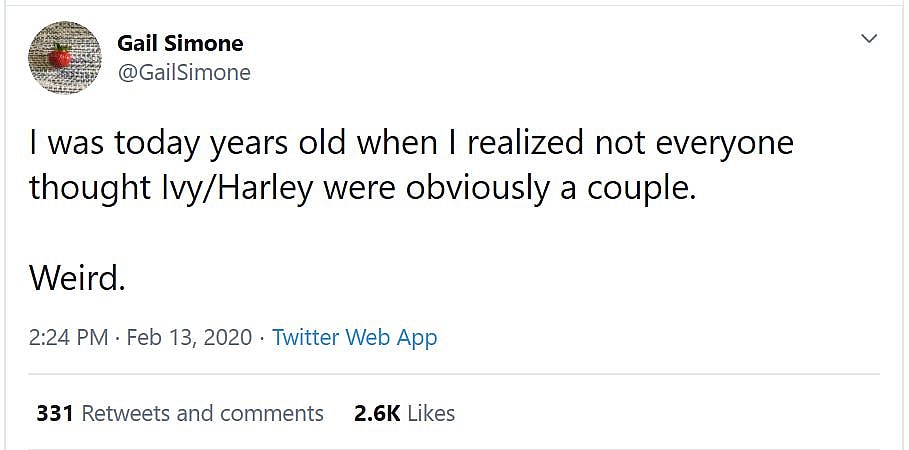 Simone wrote in February, “I was today years old when I realized not everyone thought Ivy/Harley were obviously a couple. Weird.”