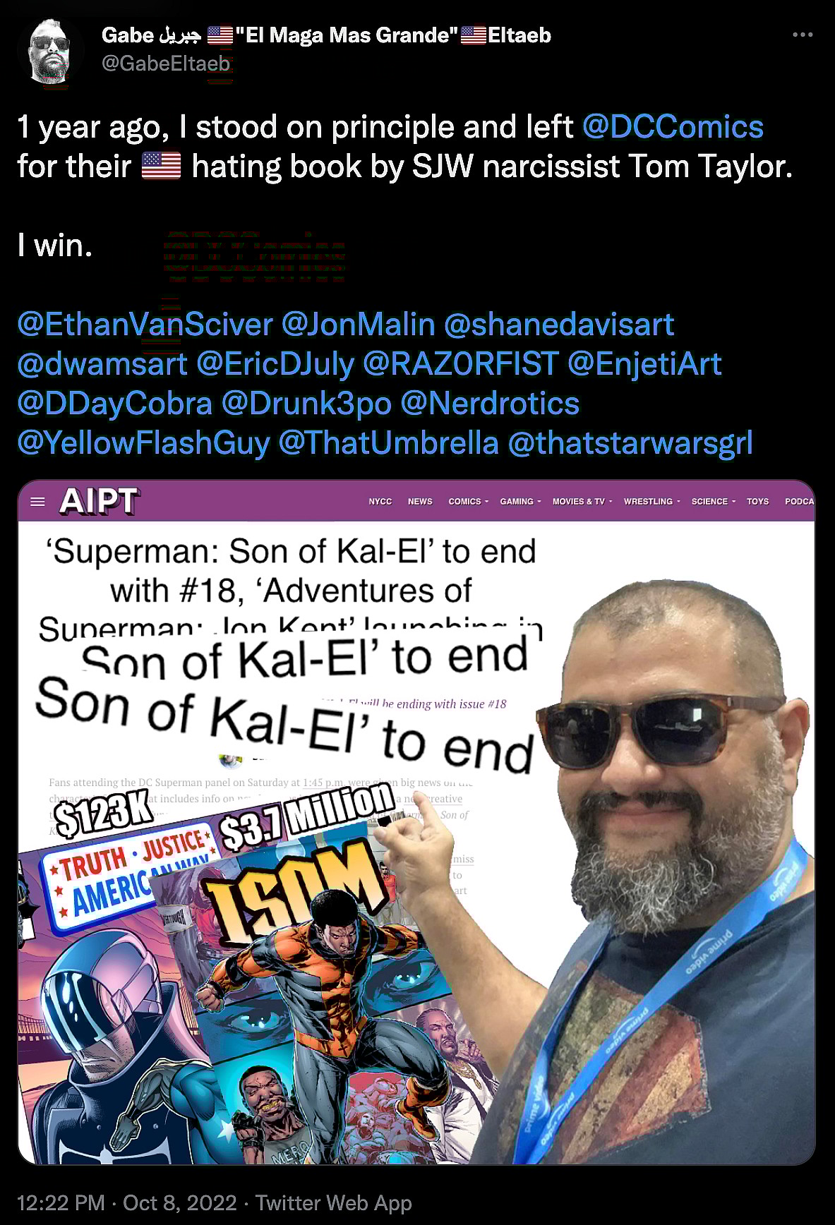“1 year ago, I stood on principle and left @DCComics for their U.S. hating book by SJW narcissist Tom Taylor. I win,” wrote Eltaeb.
