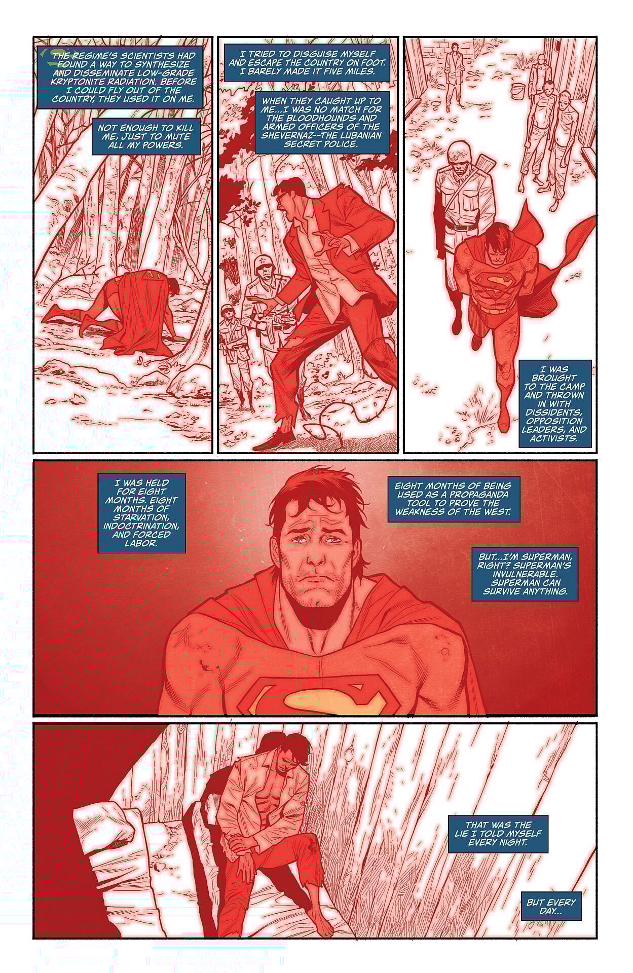 Slowly making his way through the now-defunct facility, Superman then begins to reminisce on his time as Koslov’s captive.