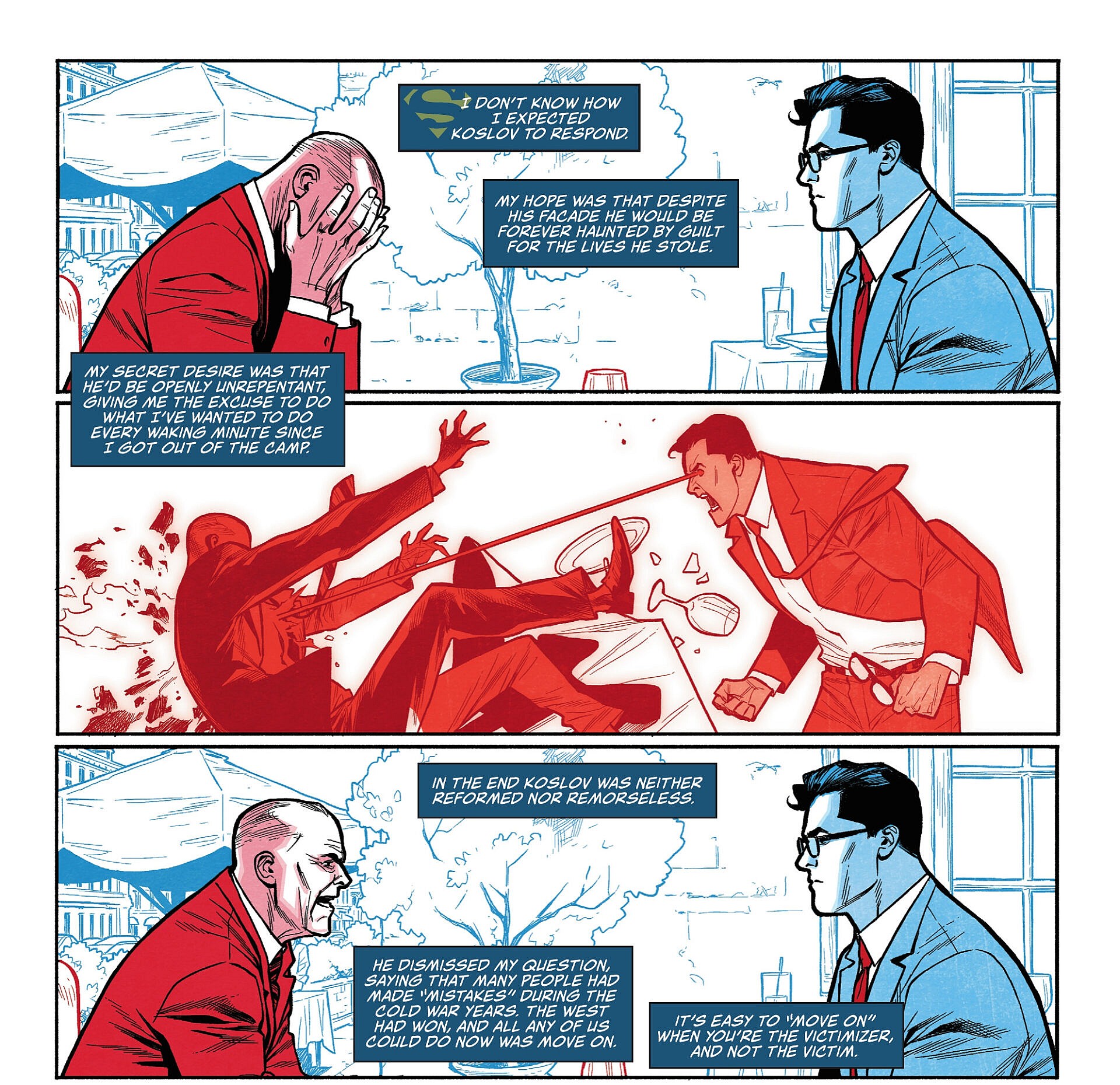 However, Clark is left unsatisfied with this response, concluding to himself, “It’s easy to ‘move on’ when you’re the victimizer, and not the victim.”
