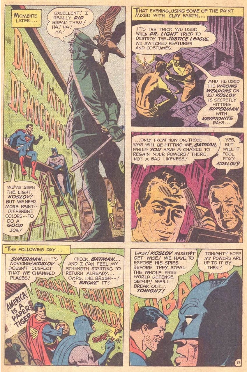 Eventually, the heroes devise a plan to switch costumes, thus misleading Koslov’s Kryptonite waves into being directed at Batman and allowing Superman to slowly regain his powers.