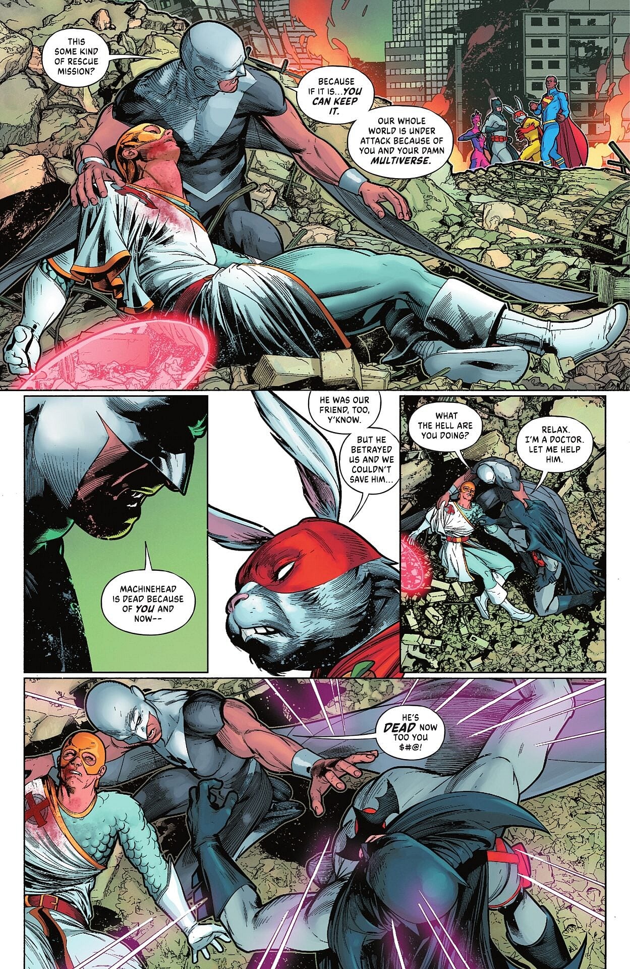Cradling the dead hero in his arms as Batman approaches to offer medical assistance, Earth-8’s version of The Falcon pushes him away, confirming, “He’s dead now too, you $#@!”