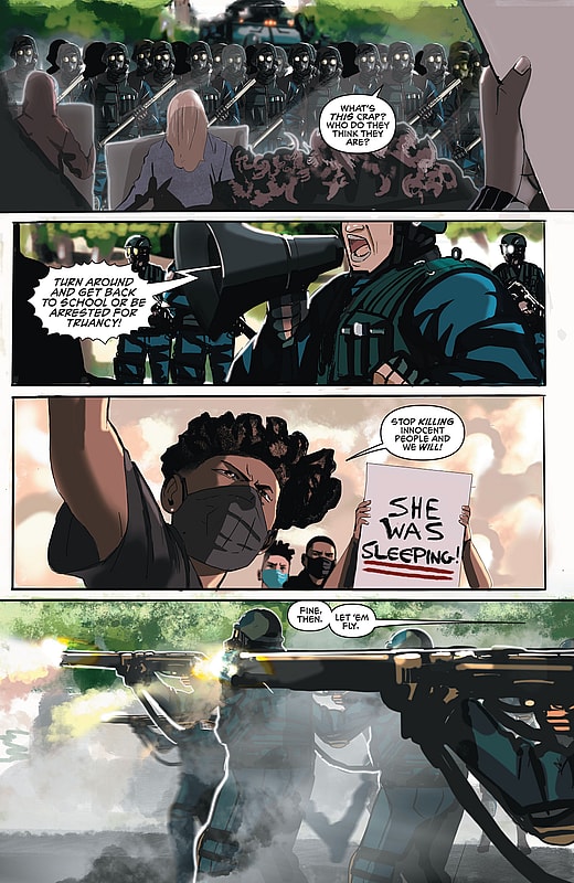 In a very one-sided, albeit unsurprising, interpretation of the recent events of this past year, the officers are depicted as trigger happy and bloodthirsty while the protestors are depicted as entirely peaceful.