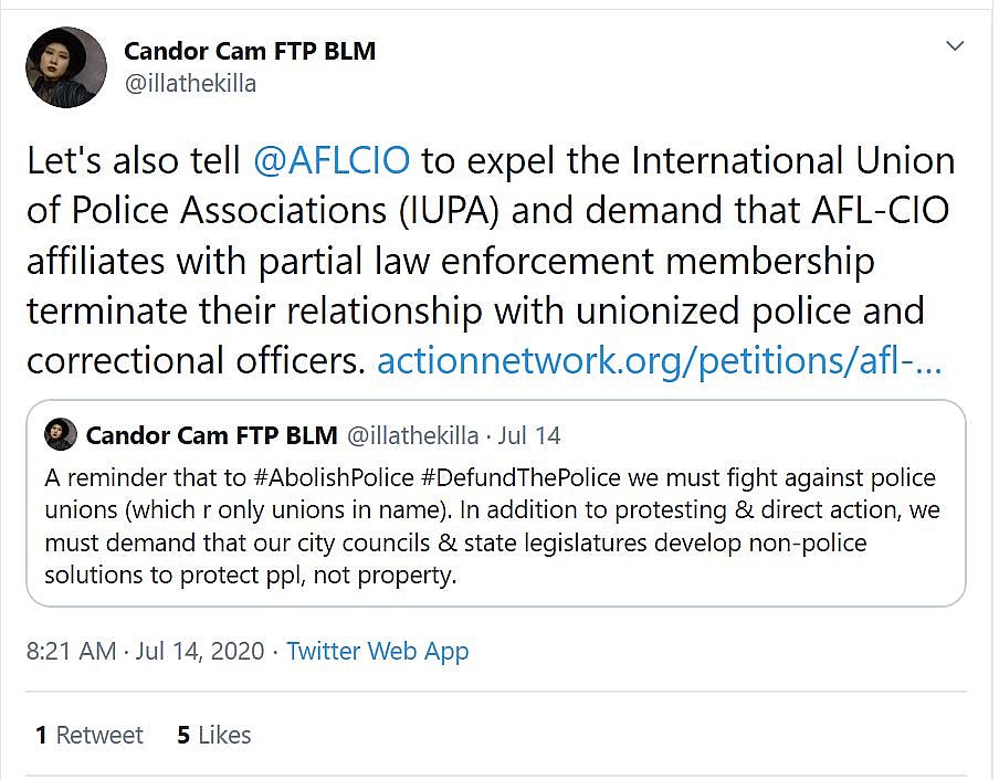 In July, she wrote, “A reminder that to #AbolishPolice #DefundThePolice we must fight against police unions (which r only union in name). In addition to protesting & direct action, we must demand that our city councils & state legislatures develop non-police solution to protect ppl, not property.”