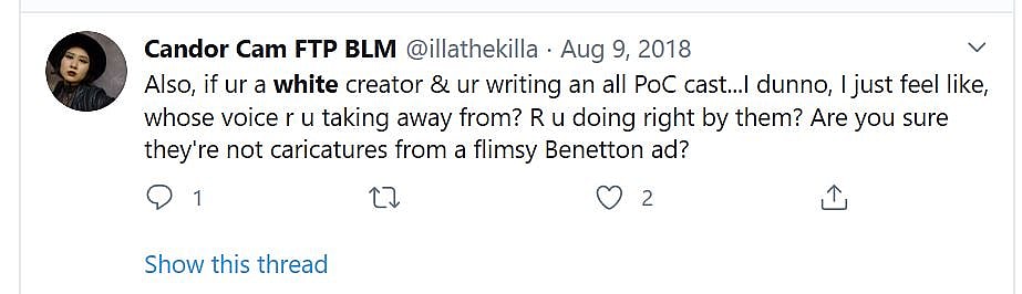 Zhang has also insinuated that white creators should not write stories with non-white casts. She wrote in August 2018, “Also, if ur a white creator & ur writing an all PoC cast…I dunno, I just feel like, whose voice r u taking away from? R u doing right by them? Are you sure they’re not caricatures from a flimsy Benetton ad?”