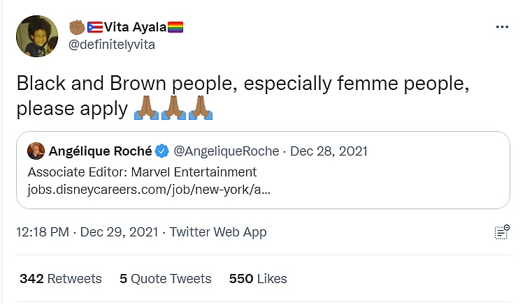 Ayala’s comments came in response to former Marvel.com writer Angélique Roché sharing a link to an associate editor position for Marvel.com.