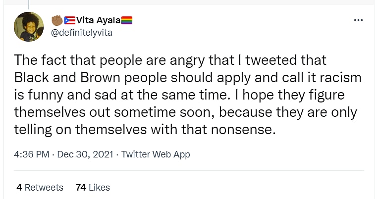 In a follow up tweet, Ayala wrote, “The fact that people are angry that I tweeted that Black and Brown people should apply and call it racism is funny and sad at the same time.”