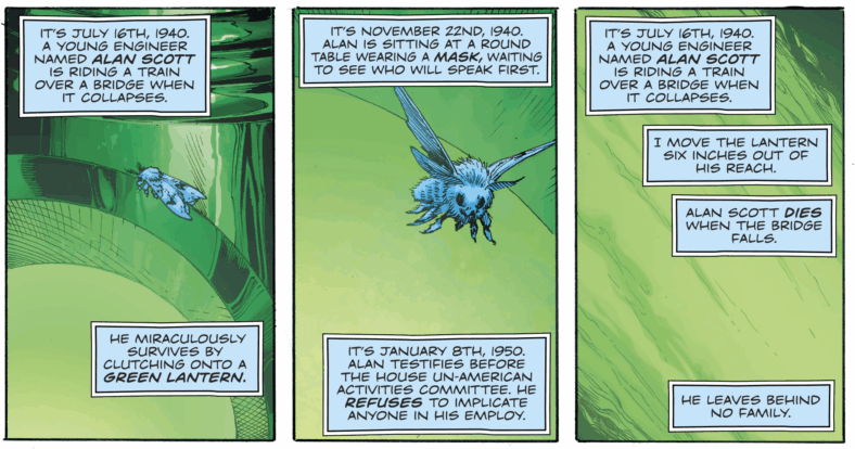 Moving along in sequence, Barry proceeds to dig deep into the DCU’s past, touching upon not only major events like the creation of the Green Lantern Corps and the debut of the Justice Society of America, but also relatively obscure ones like the Starheart’s arrival in China centuries before its discovery by Alan Scott or the Haunted Tank’s deployment on the frontlines of World War 2.