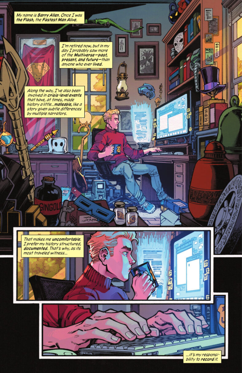 More than just a dry, encylopedia-style recap of Earth Prime’s history, this new record is framed as an in-universe work compiled by none other than Barry Allen, who after losing his powers during the course of last year’s Absolute Power event and leaving the Flash mantle solely to Wally West has chosen to occupy his time by addressing the fact that the DCU’s history is too “malleable” for his own liking.