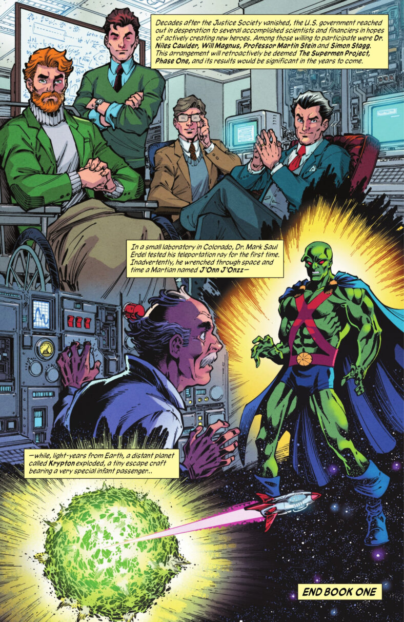 Ultimately, having gotten through the ‘ancient’ and ‘modern’ periods of Earth Prime’s existence, the hero closes out this first issue by turning his attentions to the ‘contemporary’ era, the final page of the book recalling how said era could be demarcated by three specific events: The agreement by Dr. Niles Caulder, Will Magnus, Professor Martin Stein, and Simon Stagg to work on the government-sponsored Supermen Project (the Watchmen-era program dedicated to forcibly creating superhumans, as first introduced in 2018’s Doomsday Clock), the Martian Manhunter being forcibly beamed to Earth by a Colorado scientist, and a baby Kal-El’s last-minute ejection from his exploding home planet.