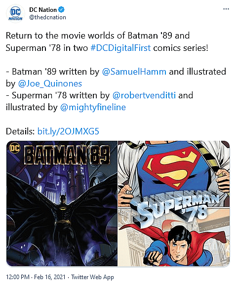 “Beginning in July 2021, decades after both Richard Donner’s Superman: The Movie and Tim Burton’s Batman introduced generations of fans to silver screen versions of DC’s Man of Steel and the World’s Greatest Detective, DC is returning to these beloved properties to tell new stories set within these worlds with the publication of a series of Superman ’78 and Batman ’89 comic books. Writer Rob Venditti and artist Wilfredo Torres will capture imaginations in Superman ’78 while screenwriter Sam Hamm and artist Joe Quinones will immerse readers into Batman ’89.”