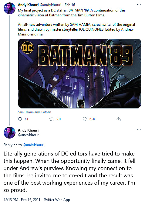 Editor Andy Khouri tweeted on the heels of the announcement Batman ‘89 is his “final project as a DC staffer,” adding that he was proud to have co-edited a project that fans wanted and that “generations of DC editors have tried to” get off the ground.