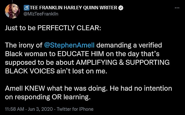 “Just to be PERFECTLY CLEAR,” declared Fraknklin. “The irony of @StephenAmell demanding a verified Black woman to EDUCATE HIM on the day that’s supposed to be about AMPLIFYING & SUPPORTING BLACK VOICES ain’t lost on me. Amell KNEW what he was doing. He had no intention on responding OR learning.”