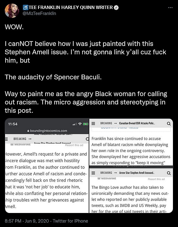 “WOW,” exclaimed the writer in June 2020. “I canNOT believe how I was just painted with this Stephen Amell issue. I’m not gonna link y’all cuz f–k him, but The audacity of Spencer Baculi. Way to paint me as the angry Black woman for calling out racism. The micro aggression and stereotyping in this post.”