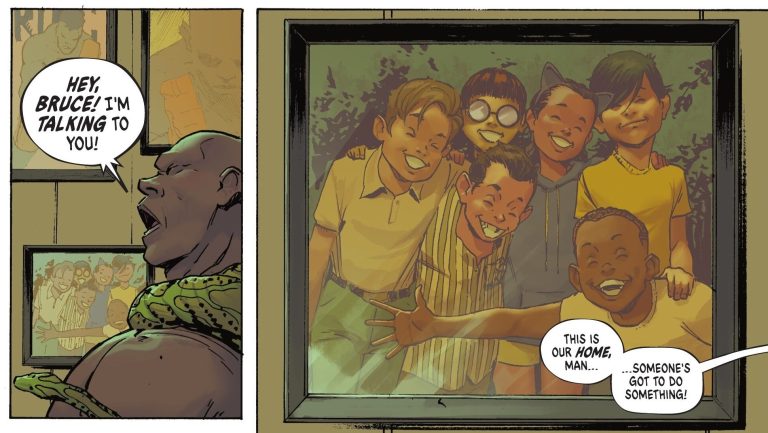 (It should be noted that while a childhood photo of Bruce and Waylon with their friends and fellow orphans shows Selina Kyle, otherwise known on Earth-0 as Catwoman, with dark skin, this is presumed to come from her half-Latin, half-Irish ethnicity (as established in 2000’s Catwoman Vol. 2 #81) rather than a Julie Neymar-style race-swap)