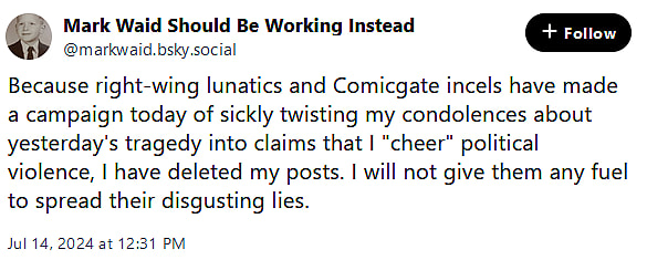 “Because right-wing lunatics and Comicgate incels have made a campaign today of sickly twisting my condolences about yesterday’s tragedy into claims that I ‘cheer’ political violence, I have deleted my posts,” wrote the veteran comic book scribe. “I will not give them any fuel to spread their disgusting lies.”