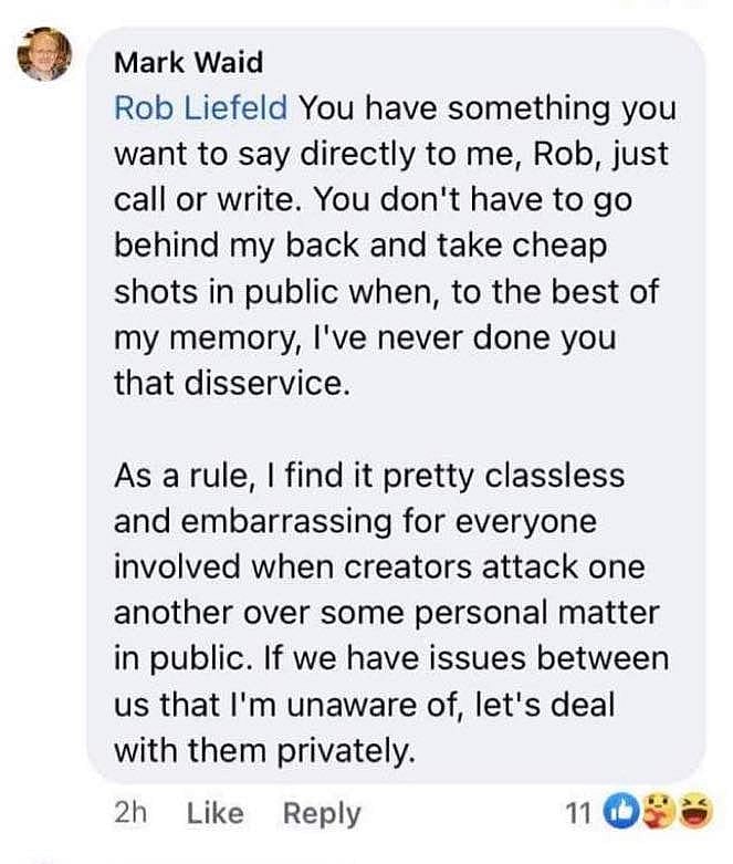 How a comment on Mark Waid’s wall is “behind his back” isn’t elaborated upon, Waid seems to forget his own writing, which would be easy to apply to Liefeld, which was both indirect and a cheap shot in public.