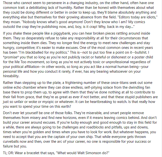 He opens his tirade by stating his post is somehow advice “for beginners and aspiring creators,” but the rambling quickly devolves into backhanded attacks on his peers for the way they’ve handled the mainstream comic industry proverbially kicking them to the curb.