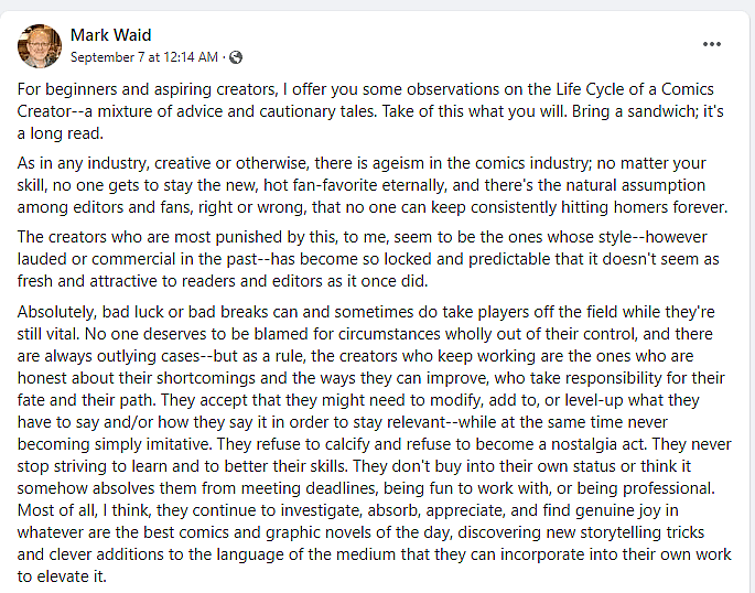Long-time DC and Marvel writer, Mark Waid, made a multi-paragraph rant on aging out of the comics industry and what he perceives as the realities of the business.