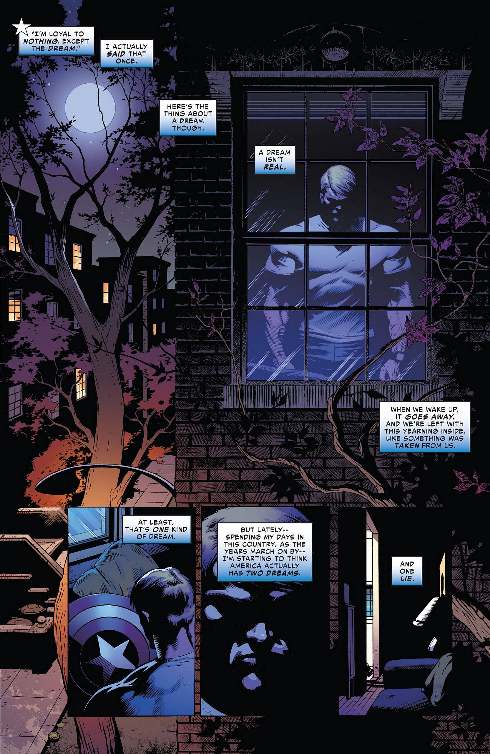 In the first issue of The United States of Captain America #1 by Christopher Cantwell and Dale Eaglesham, Cantwell has Captain America not believing in the American Dream anymore.