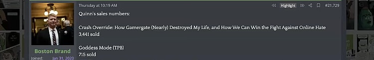 According to Nielsen BookScan numbers Del Arroz found on the forum site Kiwi Farms – and that he said he independently verified after they were posted by a publishing insider going by Boston Brand – Quinn only sold 3,441 copies of her autobiography while the trade paperback version of Goddess Mode (a Vertigo/DC release) only moved a measly 715.