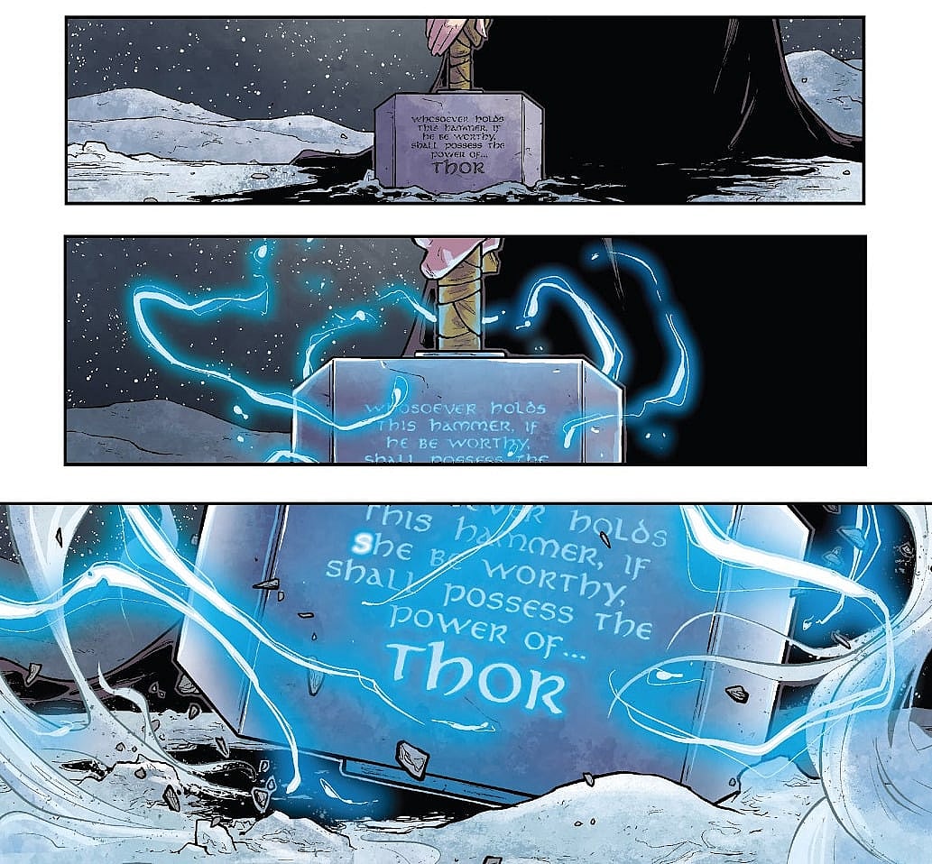 First, the hammer’s inscription was changed. Aaron changed it to read, “Whosoever holds this hammer, if she be worthy, shall possess the power of…Thor.”