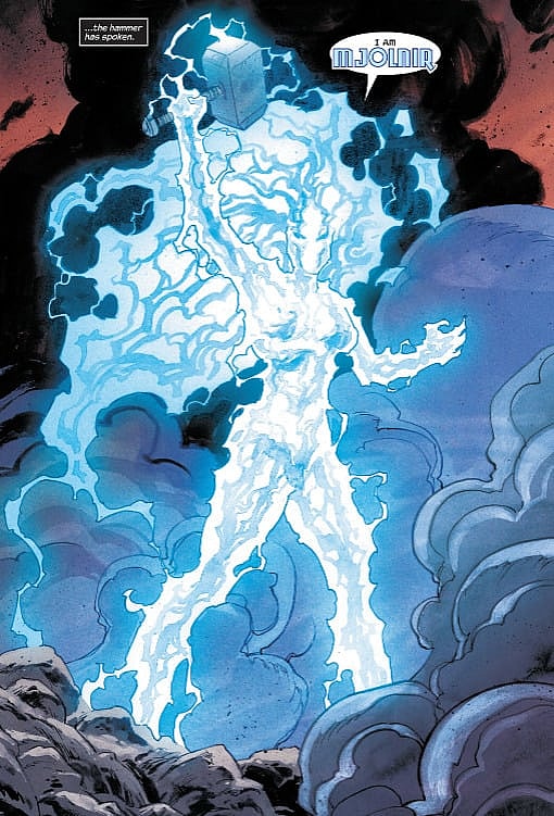 Now, in Donny Cates’ most recent issue of Thor, Thor #20, it is revealed the storm is still alive, and it’s now calling itself the God of Hammers as well as Mjolnir. It has also taken on the shape of a woman that can wield itself.