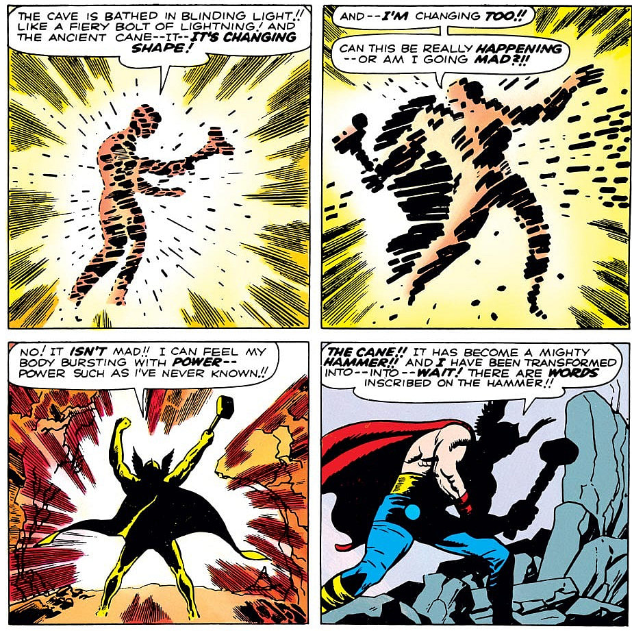 In that issue written by Stan Lee and Larry Lieber with art by Don Heck, Jack Kirby, and Steve Ditko, Doctor Donald Blake is transformed into Thor after he discovers an ancient cane. He discovered the cane after fleeing a cave following his discovery of the the arrival of a number of alien rock creatures.