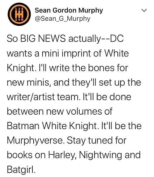 In a now-deleted tweet captured by The Splintering, Murphy detailed that DC Comics wants a “mini imprint of White Knight.” He added, “I’ll write the bones for new minis, and they’ll set up the writer/artist team.”