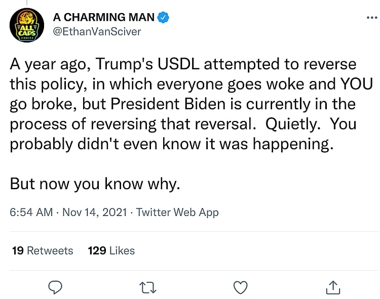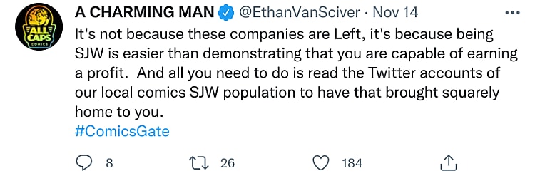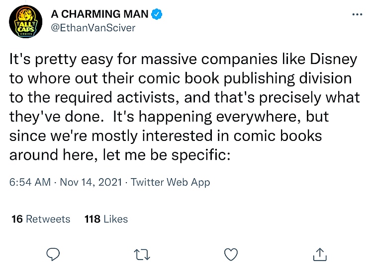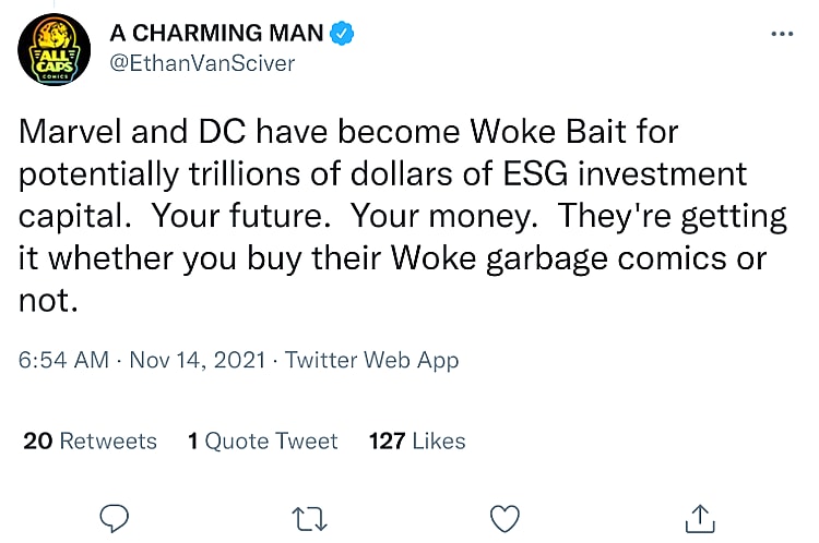In a long Twitter thread, Van Sciver wrote, “Marvel and DC have become Woke Bait for potentially trillions of dollars of ESG [environmental, social, governance] investment capital. Your future. Your money. They’re getting it whether you buy their Woke garbage comics or not.”