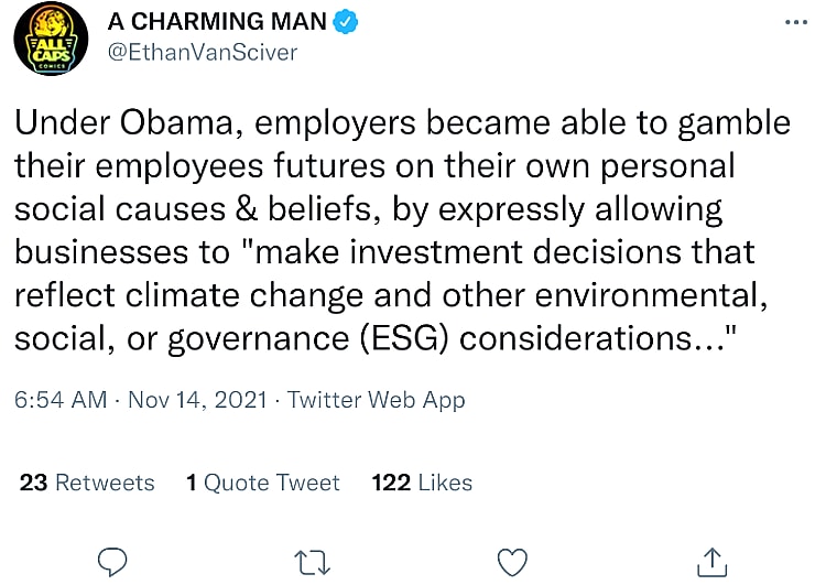 Van Sciver tweeted prior, “Under Obama, employers became able to gamble their employees’ futures on their own personal social causes & beliefs, by expressly allowing businesses to ‘make investment decisions that reflect climate change and other environmental, social, or governance (ESG) considerations…’”
