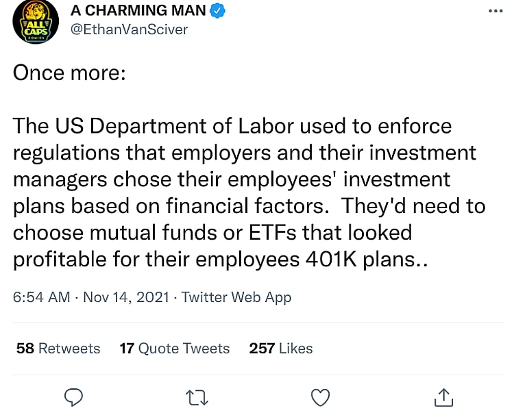 Van Sciver tweeted, “Once more: The US Department of Labor used to enforce regulations that employers and their investment managers chose their employees’ investment plans based on financial factors. They’d need to choose mutual funds or ETFs that looked profitable for their employees 401K plans..”