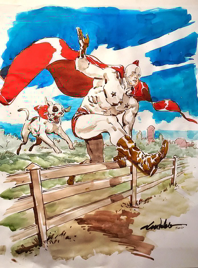 BIC: I really like the design of the character with the white suit, red cape, and red trunks and the brown almost cowboy boots. It also looks like he uses a lasso. What inspired this design?