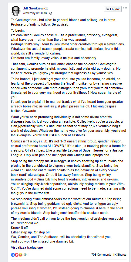 Sienkiewicz concluded the rant, “The medium didn’t call on you to be the best version of assholes you could be. Neither did we. Knock it off. Either step up. Or step off. We, Comics, and The Audience- will be absolutley fine without you. And you won’t be missed one damned bit. Visualizza traduzione.”