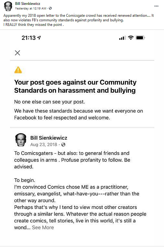Sienkiewicz recently revealed that the anti-Comicsgate rant was removed by Facebook. He posted, “Apparently my 2018 open letter to the Comicsgate crowd has received renewed attention…. It also now violates FB’s community standards against profanity and bullying. I REALLY think they missed the point.”