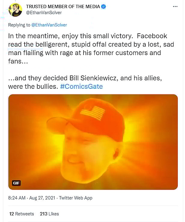 Van Sciver concluded, “In the meantime, enjoy this small victory. Facebook read the belligerent, stupid offal created by a lost, sad man flailing with rage at his former customers and fans… …and they decided Bill Sienkiewicz, and his allies, were the bullies. #ComicsGate“