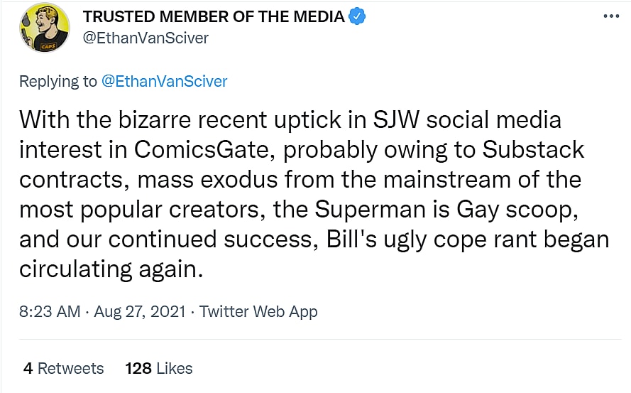 Van Sciver then wrote, “With the bizarre recent uptick in SJW social media interest in ComicsGate probably owing to Substack contracts, mass exodus from the mainstream of the most popular creators, the Superman is Gay scoop, and our continued success, Bill’s ugly cope rant began circulating again.”