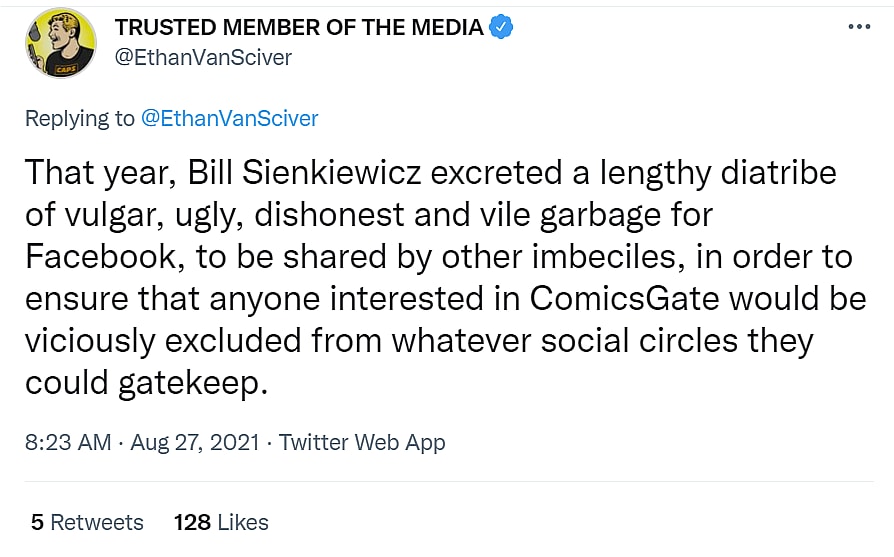 He went on, “That year, Bill Sienkiewicz excreted a lengthy diatribe of vulgar, ugly, dishonest and vile garbage for Facebook, to be shared by other imbeciles in order to ensure that anyone interested in ComicsGate would be viciously excluded from whatever social circles they could gatekeep.