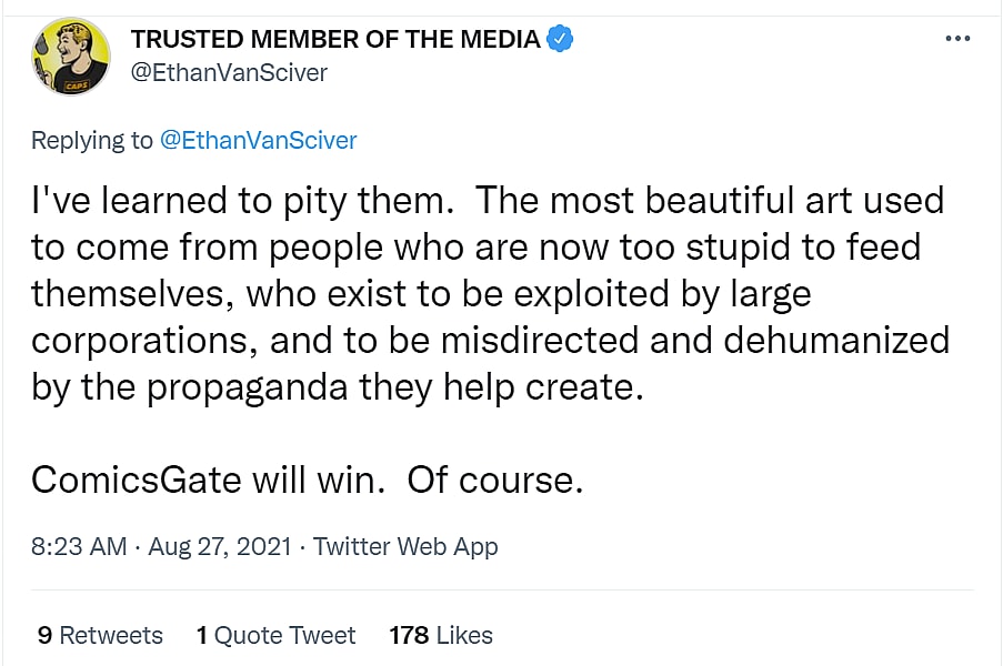 He then relayed, “I’ve learned to pity them. The most beautiful art used to come from people who are now too stupid to feed themselves, who exist to be exploited by large corporations, and to be misdirected and dehumanized by the propaganda they help create. ComicsGate will win. Of course.”