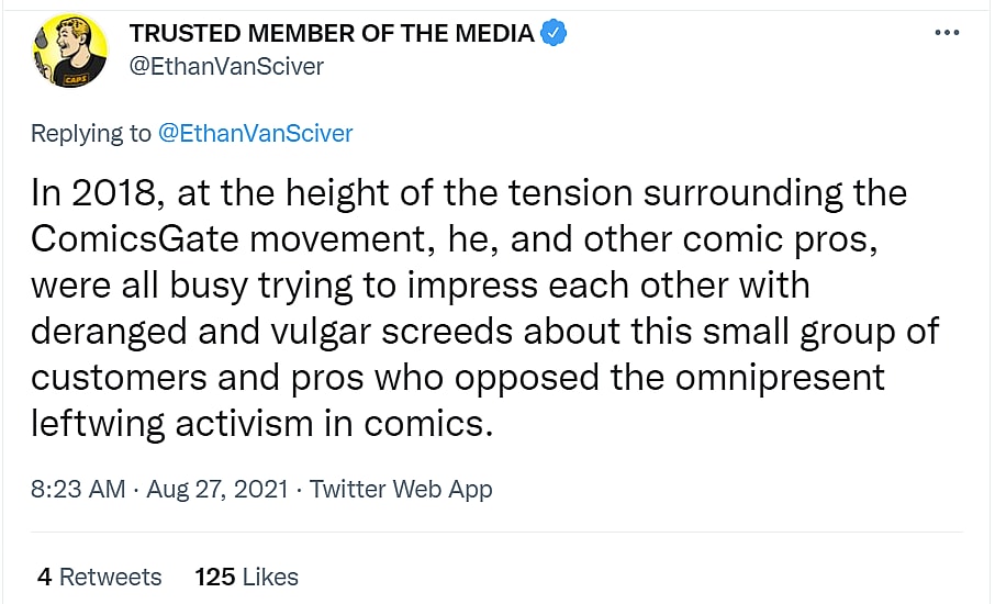 “In 2018, at the height of the tension surrounding the ComicsGate movement, he and other comic pros were all busy trying to impress each other with deranged and vulgar screeds about this small group of customers and pros who opposed the omnipresent leftwing activism in comics,” the Cyberfrog creator tweeted.