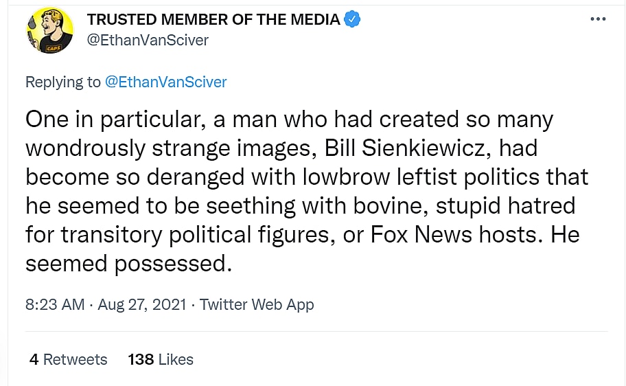 He continued, “One in particular, a man who had created so many wondrously strange images, Bill Sienkiewicz, had become so deranged with lowbrow leftist politics that he seemed to be seething with bovine, stupid hatred for transitory political figures, or Fox News hosts. He seemed possessed.”