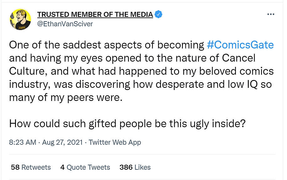 Van Sciver wrote, “One of the saddest aspects of becoming #ComicsGate and having my eyes opened to the nature of Cancel Culture, and what had happened to my beloved comics industry, was discovering how desperate and low IQ so many of my peers were. How could such gifted people be this ugly inside?”