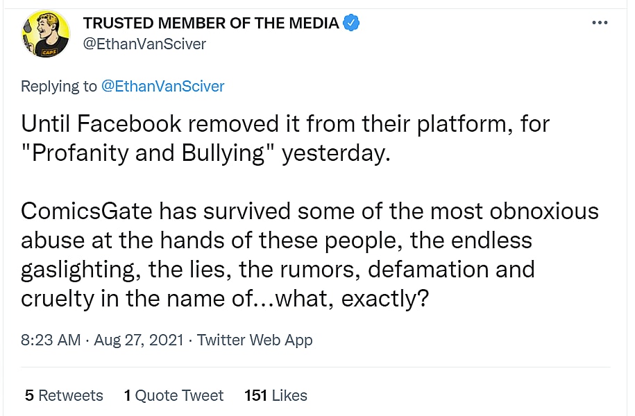 He tweeted, “Until Facebook removed it from their platform, for “Profanity and Bullying” yesterday. ComicsGate has survived some of the most obnoxious abuse at the hands of these people, the endless gaslighting, the lies, the rumors, defamation and cruelty in the name of…what, exactly?”