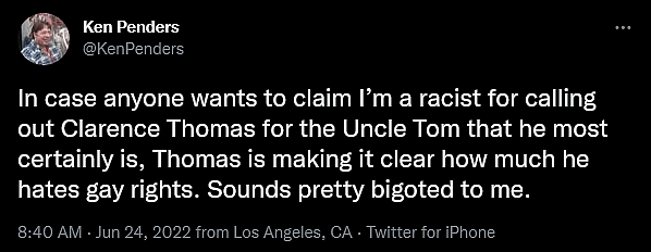 Receiving immediate backlash and accusations of racism to his post, Penders doubled down, pushing back against his critics, “In case anyone wants to claim I’m a racist for calling out Clarence Thomas for the Uncle Tom that he most certainly is, Thomas is making it clear how much he hates gay rights.”