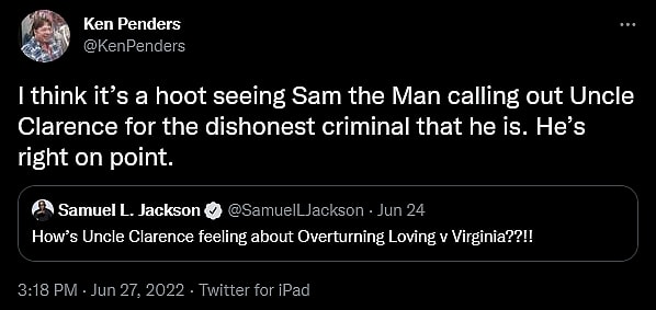 Retweeting Marvel star Samuel L. Jackson’s tweet in which he asked “How’s Uncle Clarence feeling about Overturning Loving v Virginia??!!”, Penders added, “I think it’s a hoot seeing Sam the Man calling out Uncle Clarence for the dishonest criminal that he is. He’s right on point.”