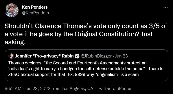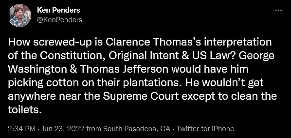 Notably, in response to Thomas’ decision just days prior that “the Second and Fourteenth Amendments protect an individual’s rights to carry a handgun for self-defense outside the home”, striking down New York’s concealed carry restrictions, Penders inquired to his followers, “Shouldn’t Clarence Thomas’s vote only count as 3/5 of a vote if he goes by the Original Constitution? Just asking.”